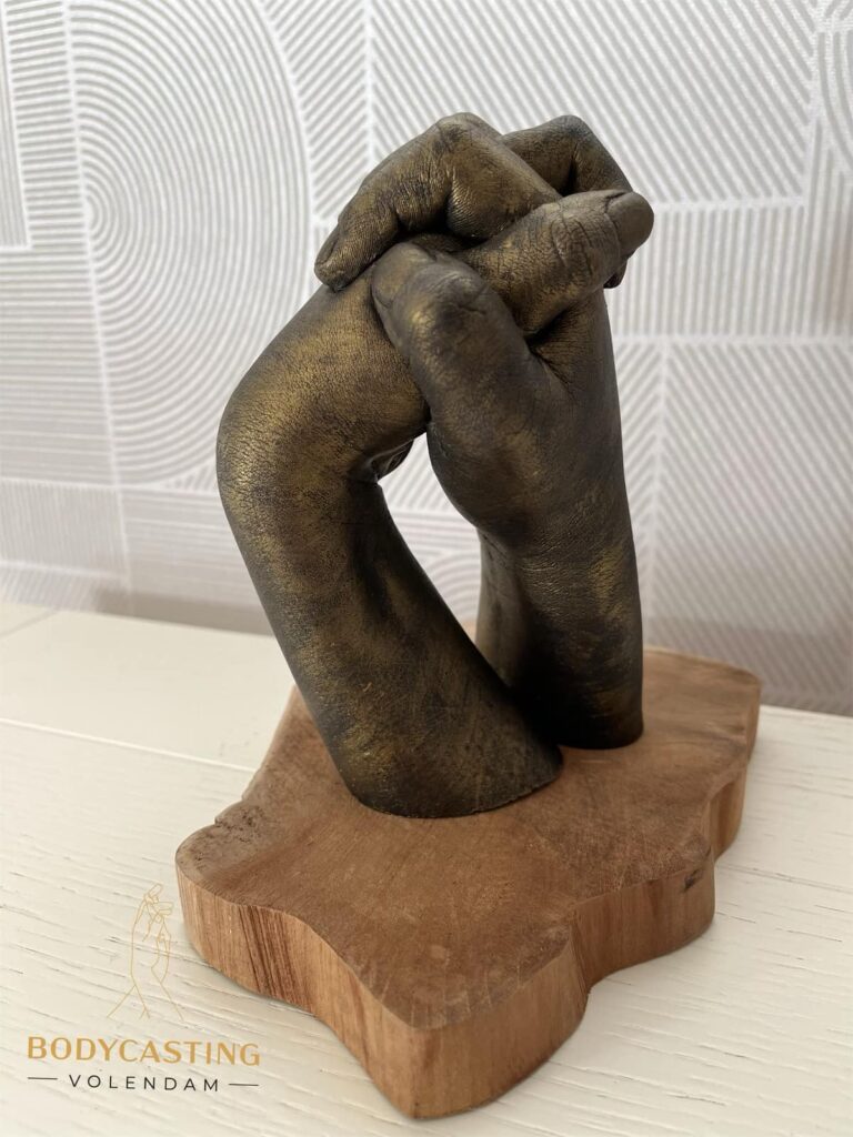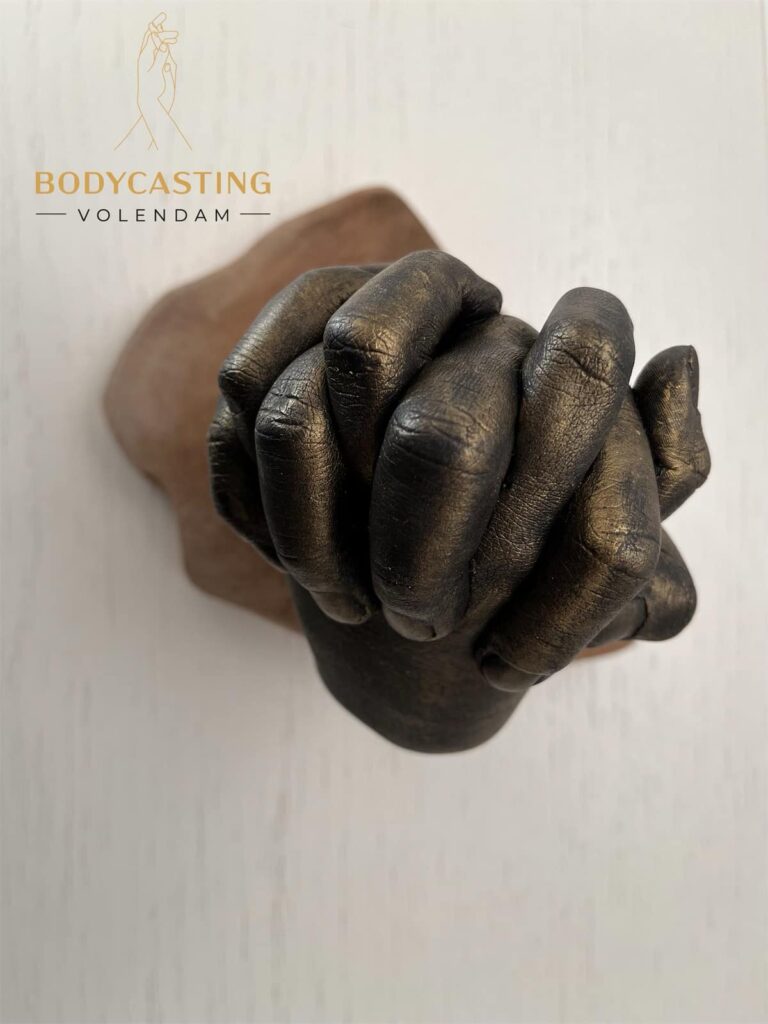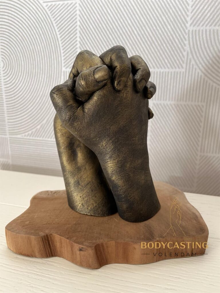 Mijn dochter Eva en neefje Cor zagen al veel handbeelden voorbij komen en wilden heel graag ook een beeld maken samen. Ze zijn namelijk de allerbeste vrienden en missen elkaar na 1 dag al. Ze hadden zelf de houding bedacht en kozen voor de kleur goud. Heel toepasselijk voor deze twee boefjes met een hartje van goud ![]()
